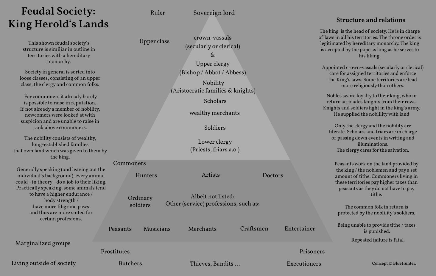 Commoners (peasants working on fields; often animals with strength such as cows and donkeys or smaller "farm animals in our perspective" ) were protected by the nobility (in this kingdom: often by dogs) in trade of providing tithe. In general it is a cooperation between animals of all diets that try to live and provide for each other. But those that failed to provide tithe a multitude of times, often were in danger to end up puninished fatally.