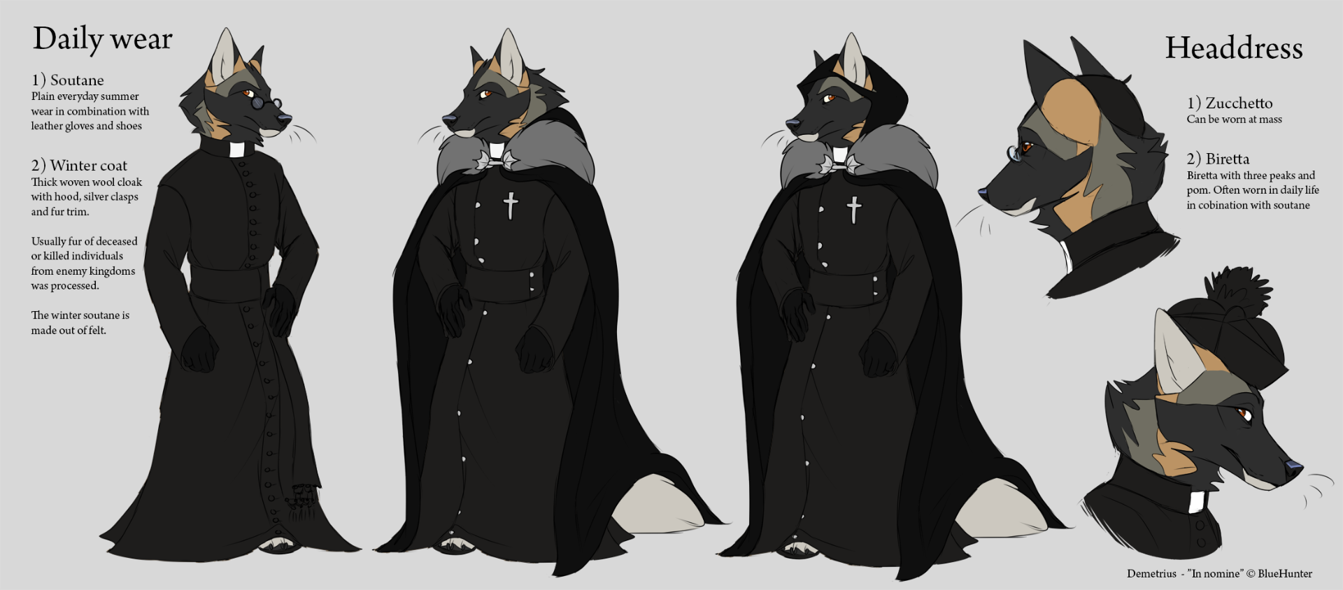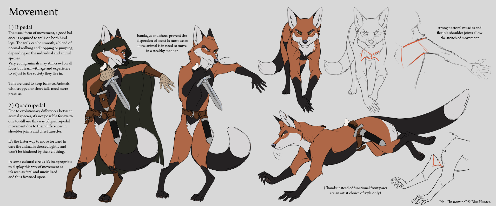 I'm fascinated by the genre of xenofiction, stories with a feral-minded-narrative, and call nature one of my biggest inspiration. Yet I want to pick up my art the way I started creating characters in the first place: Semi-anthropomorphic.A center point of this story is that many characters, namely those living in "King Herold's kingdom" (Placeholder name) suppress their "inner animal" for whatever reason I decided. In contrast are those animal folks that live in the forest under their animistic belief; even highlighting their feral nature in special ceremonies.If I were to draw these characters in a different anthropomorphic stylization, this story would not work out for me, as I personally associate planti- and digitigrade characters with a higher grade of anthropomorphization; many of the conflicts In nomine would fall flat, and the story would be a whole different one. The characters' animalistic essence would disappear. The use of semi-anthropomorphic characters allows me a more complex story-telling, which wouldn't work in any other way to me.Demetrius for example is a highly conflicted character that tries to suppress his inner being by faith. Ida on the other hand is much more societally-detached from the point of view of the commoner of the main kingdom; is feral in nature, even often walking on all fours, showing much more fox-like behaviour than the priest for example - yet she has the same level of perception and awareness of course. I want to create a different kind of conflict and tension; a world where one spark could cause a catastrophe; an animal to snap out of his mind and to return to its true nature.In the end many of my characters are simply animals fighting their nature: Just as many humans do: Suppressing their primal / nature bound instincts / roots / in a forming modern society.
