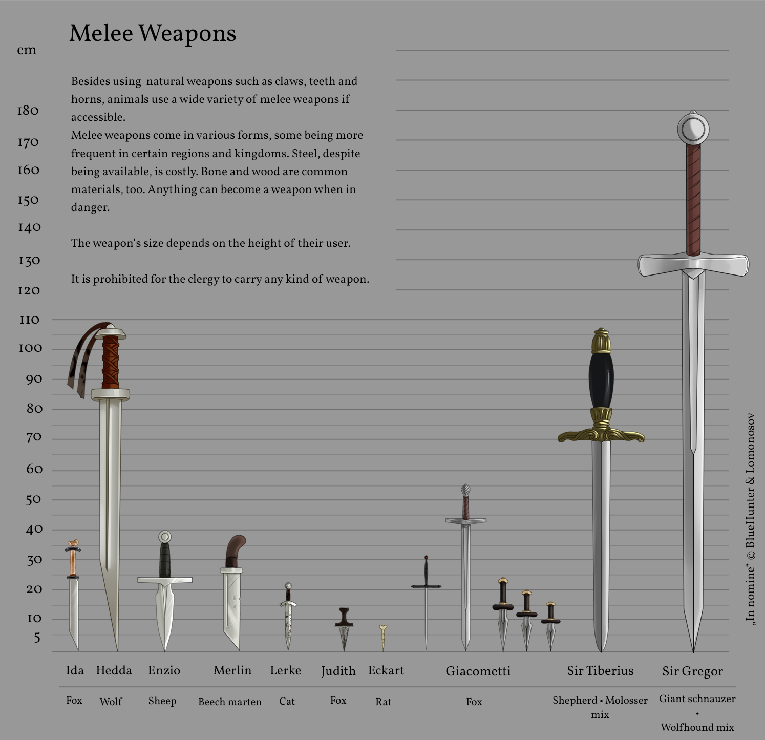 The sizes of the anthropomorphic animals of the world of "in nomine" are losely based on their real life counterparts - but on two legs.Due to sexual dimorphism displayed in many species, most female animals do not grow as tall as their male counterpart.A size lineup. Not all characters are represented here, this sizing chart gets updated by time: