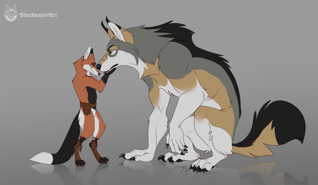 While the feral counterpart to the presently living anthropomorphic animals (wolves in this example) have long gone extinct, new subspecies have developed further, which at no time existed in a feral form (as in dogs). Simultaneously on a separate evolutionary path, wolves have persisted to the modern day developing an anthropomorphic form that could be regarded loosely like a subspecies of its own, as with other animals such as foxes, deer, etc.At no time and in no case the feral form of an animal can be found simultaneously with their anthropomorphic evolution.While the standart form of movement changed to a bipedal walk, instincts are rather active and sharp still while remaining almost unchanged. Though, animals belonging to a kingdom or community succumb to rules of (their) society now. Click the following links to learn more about communication and the diverse forms of walking.In myths and tales animal folks still are heard to speak about their ancestors, their "old form", and depict such in art. Dogs - with a bit of the artist's or storyteller's creative freedom - can be be feralized, too.